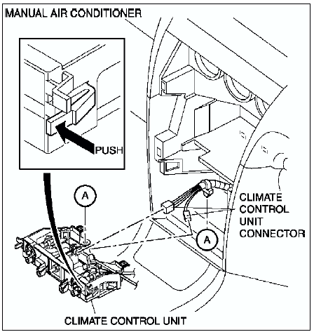 6. Disconnect the climate control unit connectors and remove the climate control unit. (Manual air conditioner)