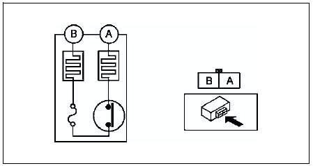 3. While inspecting for continuity between the terminals A and B of the connector, use a dryer to warm the thermostat of the seat warmer unit on seat cushion.